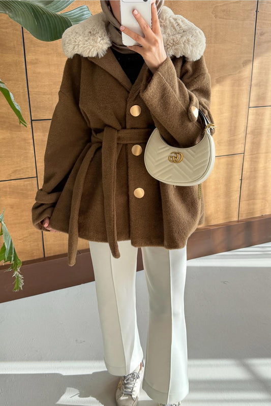 SAVE 35%Yakası Kürk Detaylı Kaban Kahverengi