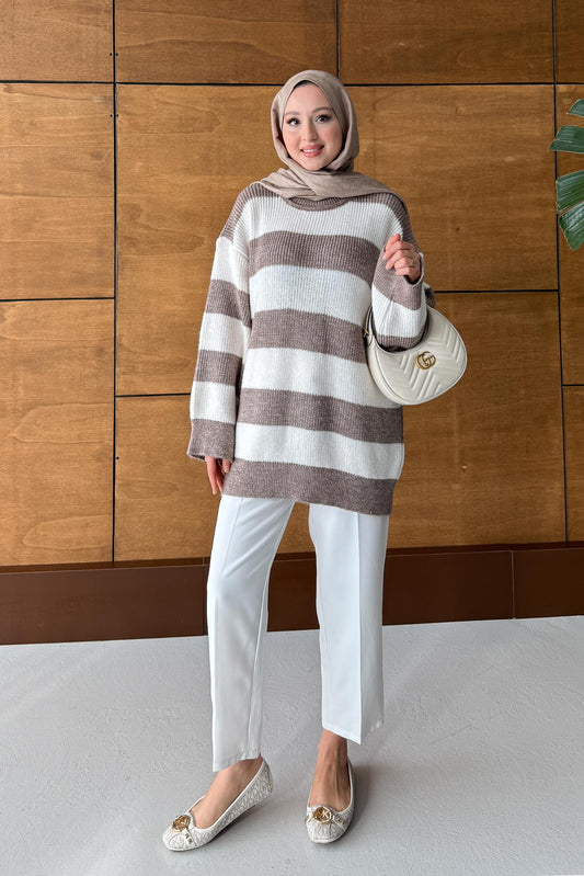 Oversize Çizgi Triko Tunik Vizon