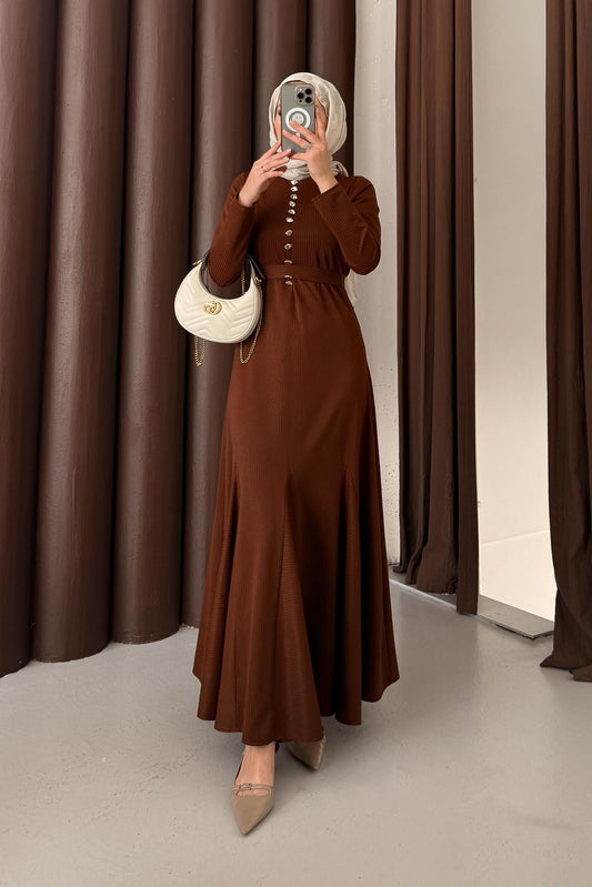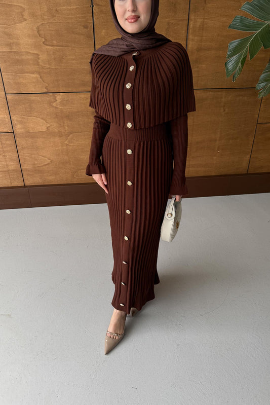 Pelerin Broş Düğmeli Elbise Kahverengi